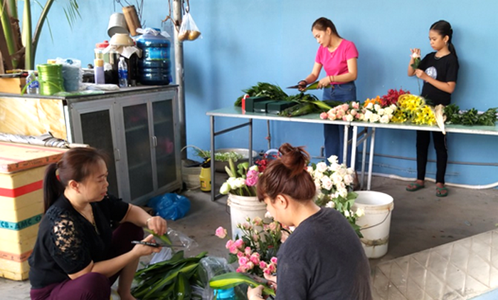 Chị Hảo (áo hồng) cùng chị em làm việc tại xưởng hoa