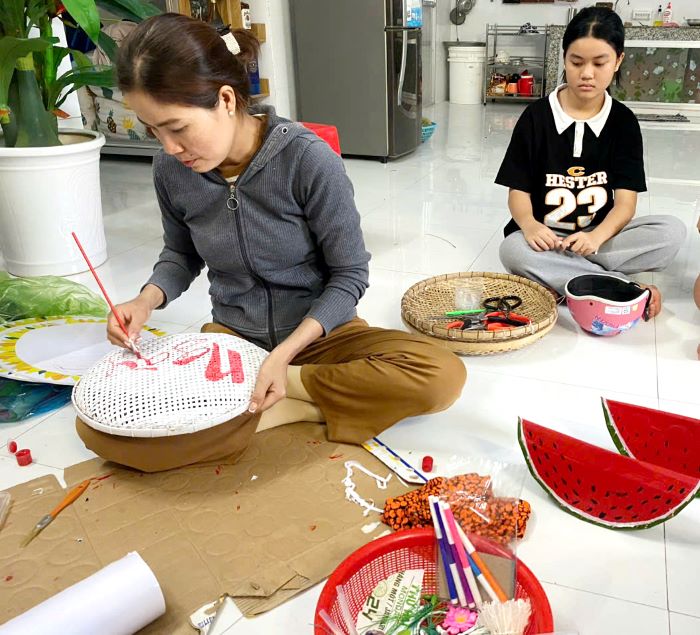 Chị Dung trang trí cho trại xuân