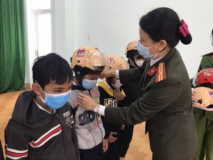 Hội Phụ nữ Công an tỉnh tặng mũ bảo hiểm cho các em học sinh