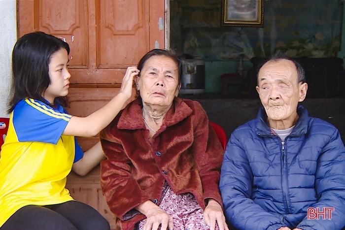 Mới 11 tuổi, em Trần Thị Nhật Lệ ở xã Kỳ Bắc, huyện Kỳ Anh đã phải chịu cảnh mồ côi, sống với ông bà ngoại đều trên 80 tuổi. Ông thì bị mù 2 mắt, bà bị bệnh tai biến, em sớm phải cáng đáng việc nội trợ, chăm sóc ông bà.