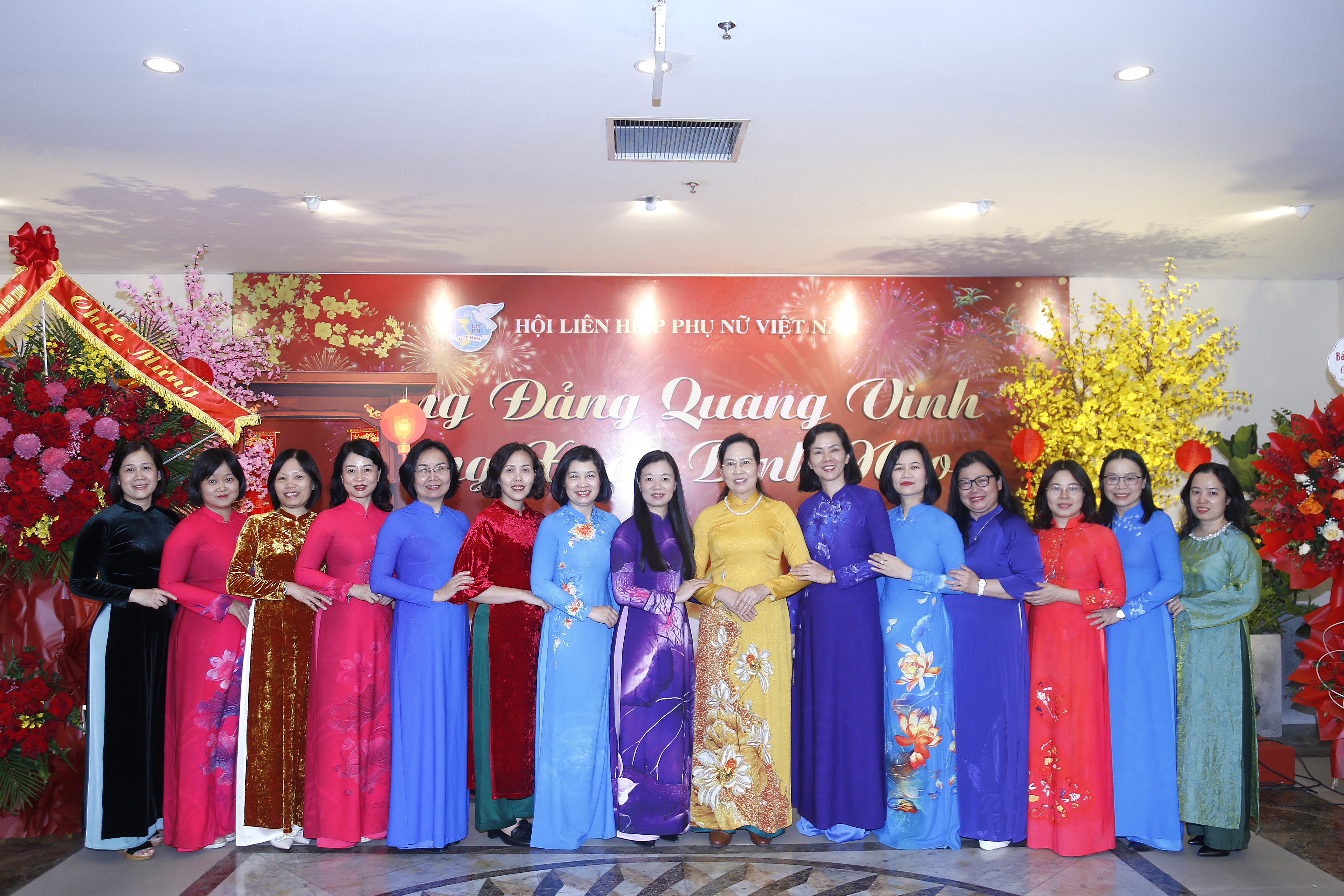 Tân Bí thư Đảng uỷ TW Hội LHPN Việt Nam Lê Thị Thuỷ (Áo dài vàng) cùng các Phó Chủ tịch Hội LHPN Việt Nam Nguyễn Thị Minh Hương (thứ 6 phải sang), Nguyễn Thị Thu Hiền (thứ 8 trái sang) và các lãnh đạo Ban Công tác Phụ nữ, TW Hội LHPN Việt Nam hưởng ứng Tuần lễ Áo dài