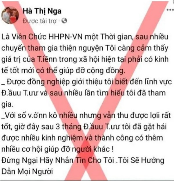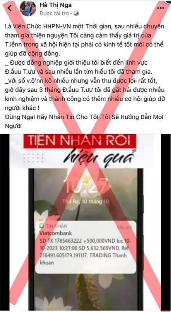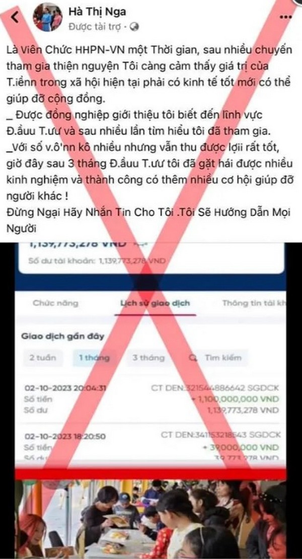 Hình ảnh trang giả mạo Chủ tịch Hội LHPN Việt Nam Hà Thị Nga được đăng trên fanpage của Hội LHPN Việt Nam nhằm cảnh báo tới mọi người. Cụ thể, fanpage Hà Thị Nga đã sử dụng trái phép hình ảnh bà Hà Thị Nga làm hình ảnh đại diện, rồi đăng thông tin quảng cáo mời gọi tham gia đầu tư tài chính. Để thuyết phục mọi người tin theo, ngoài những thông tin sai sự thật, đối tượng lừa đảo còn đưa ra hình ảnh tài khoản với số tiền chuyển vào lên tới 1,1 tỷ đồng. Hình ảnh đăng tải trên trang này cho thấy dấu hiệu sử dụng công nghệ chỉnh sửa ảnh. Thông tin trên trang này đưa ra nhằm dẫn dụ những người nhẹ dạ tin tưởng và sập bẫy lừa đảo.