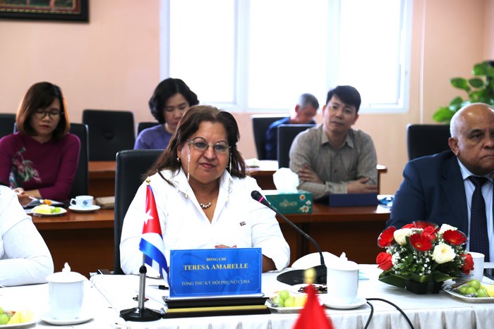 Trao đổi về tình hình phụ nữ hai nước, bà Teresa Amarelle thông tin thêm: Cuba hiện có 81 nghìn chi hội phụ nữ, hoạt động từ cấp cơ sở đến trung ương; có đến 70% các nhà khoa học của Cuba là phụ nữ - những người góp công đáng kể trong việc chế ra vaccine chống lại dịch bệnh Covid-19. Tại Cuba, ở cấp cơ sở, nữ giới chiếm 44% trong các vị trí lãnh đạo; ở cấp quận/huyện, lãnh đạo nữ chiếm 54%. Cuba cũng là quốc gia có tỉ lệ nữ đại biểu Quốc hội đạt 55,7%, đứng thứ 2 trên toàn thế giới về số lượng nữ nghị sĩ.