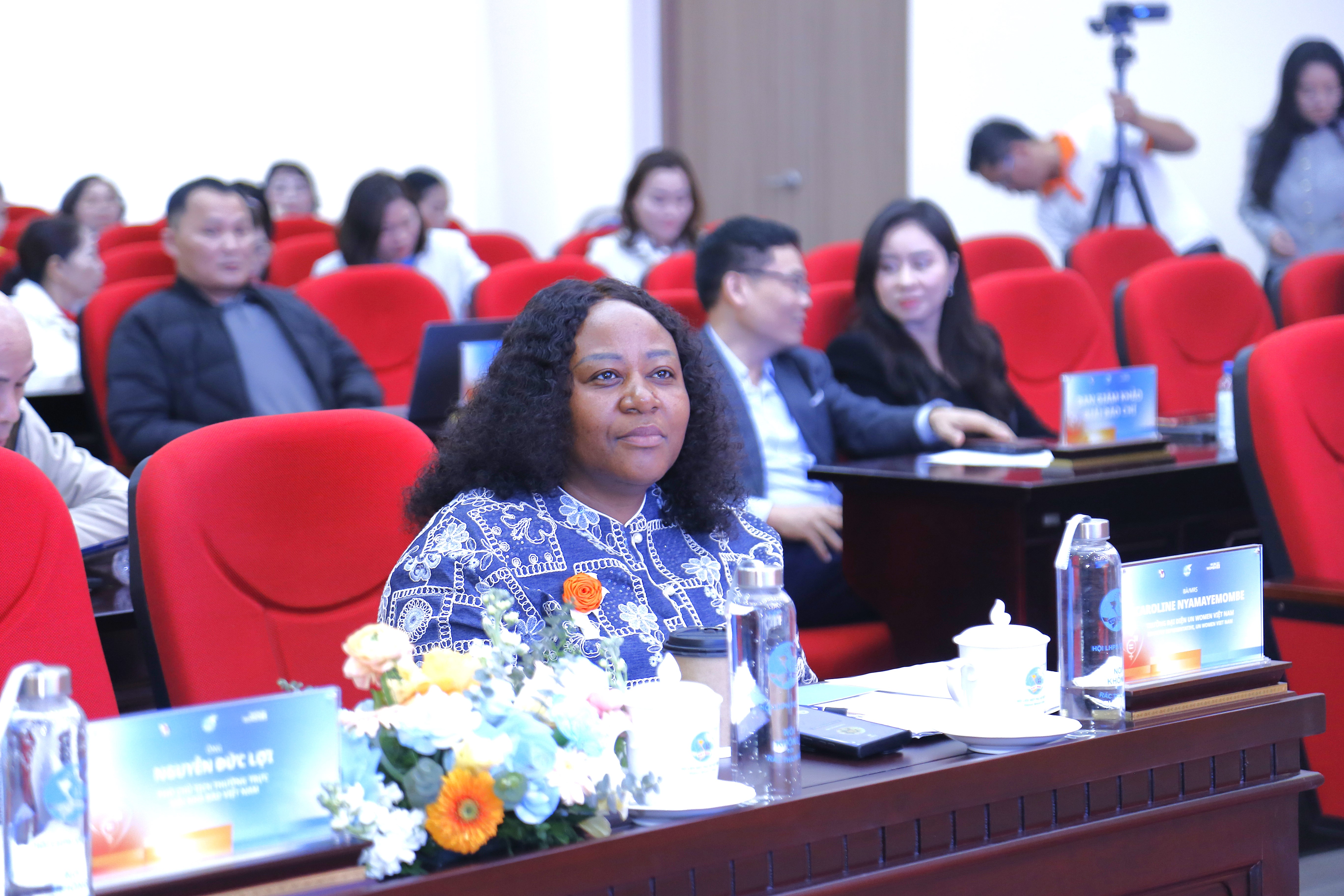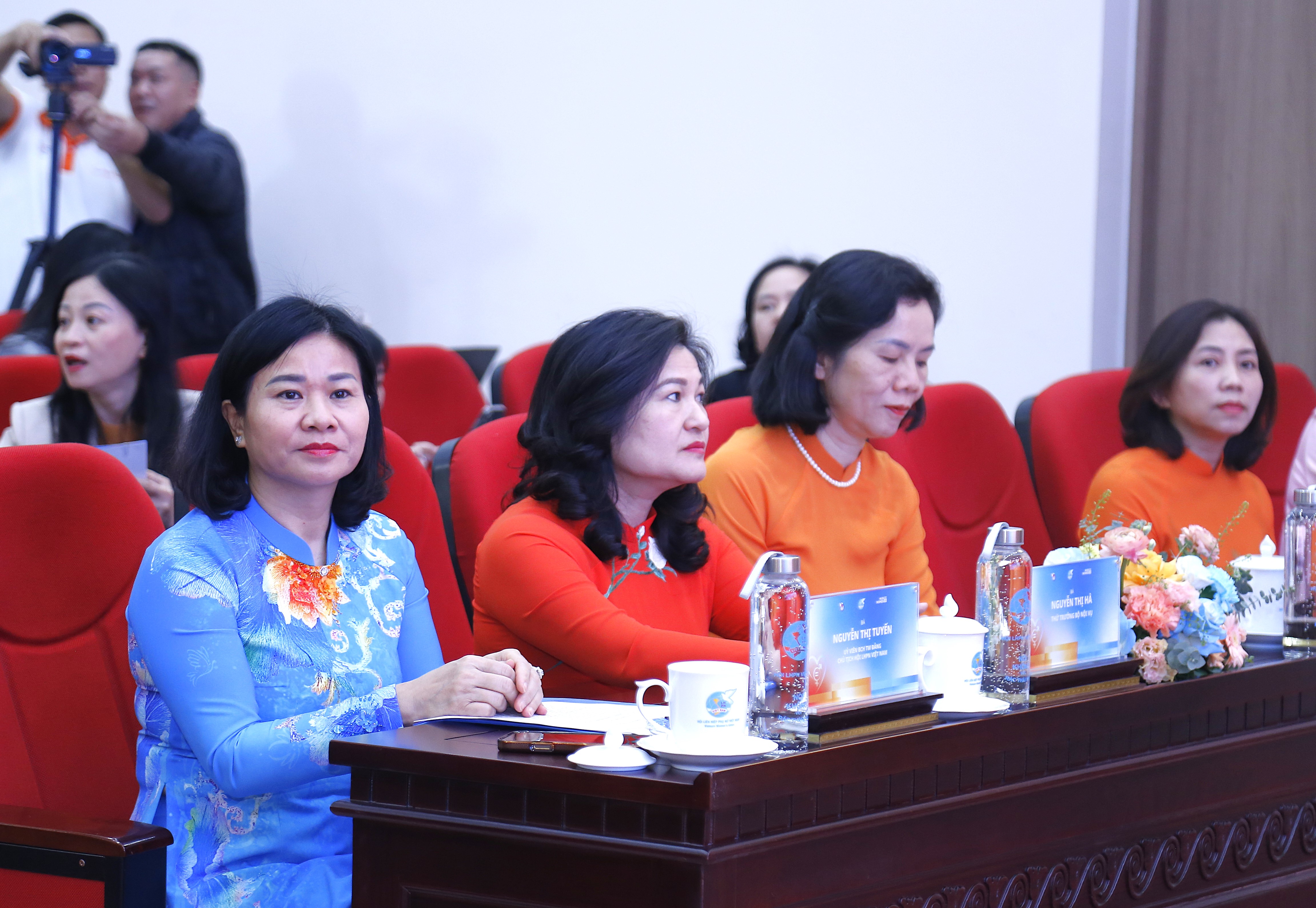 Chủ tịch Hội LHPN Việt Nam Nguyễn Thị Tuyến (giữa); Thứ trưởng Bộ Nội vụ Nguyễn Thị Hà (thứ 4 từ trái sang); Phó Chủ tịch Hội LHPN Việt Nam Nguyễn Thị Minh Hương (trái ảnh); Trưởng Đại diện UN Women tại Việt Nam Caroline Nyamayemombe (thứ 4 từ phải sang); Phó Chủ tịch Thường trực Hội Nhà báo Việt Nam Nguyễn Đức Lợi (thứ 3 từ phải sang) và các đại biểu tham dự chương trình