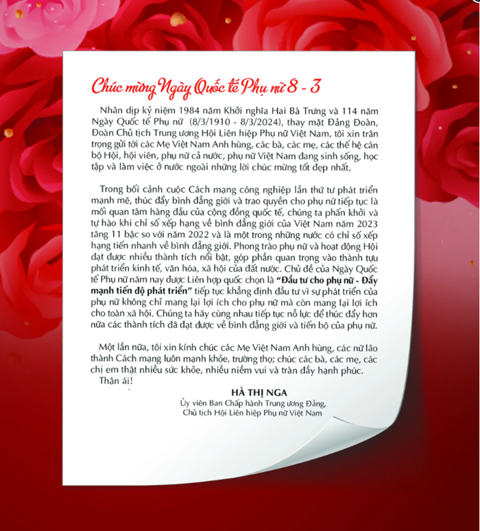 Nhân dịp kỷ niệm 1984 năm Khởi nghĩa Hai Bà Trưng và 114 năm Ngày Quốc tế Phụ nữ (8/3/1910 - 8/3/2024), thay mặt Đảng Đoàn, Đoàn Chủ tịch Trung ương Hội Liên hiệp Phụ nữ Việt Nam, tôi xin trân trọng gửi tới các Mẹ Việt Nam Anh hùng, các bà, các mẹ, các thế hệ cán bộ Hội, hội viên, phụ nữ cả nước, phụ nữ Việt Nam đang sinh sống, học tập và làm việc ở nước ngoài những lời chúc mừng tốt đẹp nhất.