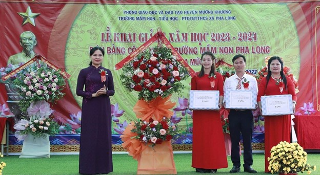 Đồng chí Hà Thị Nga đã tặng hoa và quà cho 3 nhà trường (mầm non, tiểu học, trung học cơ sở), và trao học bổng cho các em học sinh. Kết thúc buổi lễ, Chủ tịch Hội LHPN cùng các lãnh đạo tỉnh Lào Cai và Nhà trường tổ chức trồng cây lưu niệm tại Trường Mầm non Pha Long.