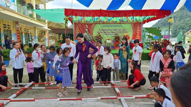 Chủ tịch Hội LHPN Việt Nam Hà Thị Nga và trẻ em trường mầm non xã biên giới Pha Long (Mường Khương, Lào Cai) trong ngày Khai giảng. Hòa chung không khí tưng bừng, phấn khởi của cả nước chào đón “Ngày toàn dân đưa trẻ đến trường” và khai giảng năm học mới 2023-2024. Đoàn công tác của Hội LHPN Việt Nam, do đồng chí Hà Thị Nga Ủy viên Ban Chấp hành Trung ương Đảng, Chủ tịch Hội LHPN Việt Nam dẫn đầu, đã đến thăm và dự lễ khai giảng năm học mới tại Trường Mầm non - Tiểu học - PTDTBT THCS xã Pha Long.