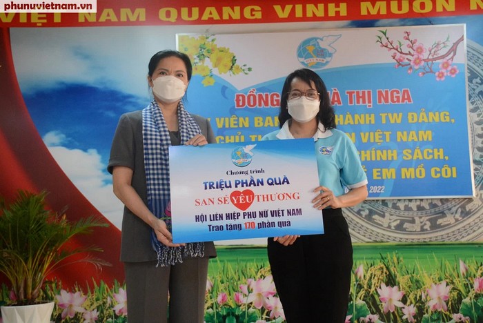 Chủ tịch Hội LHPN Việt Nam Hà Thị Nga (bìa trái) trao bảng tượng trưng 170 suất quà từ chương trình "Triệu phần quà san sẻ yêu thương" cho hội viên phụ nữ, người dân và trẻ em mồ côi đang gặp khó khăn do ảnh hưởng bởi dịch Covid-19 trên địa bàn tỉnh Đồng Tháp