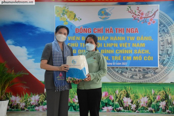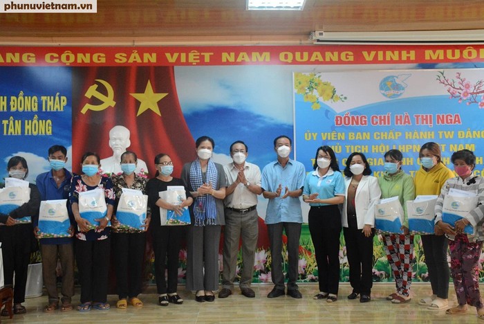 Bà Hà Thị Nga (bìa trái), Ủy viên TƯ Đảng, Chủ tịch Hội LHPN Việt Nam, thăm, tặng quà Tết cho phụ nữ khó khăn tại Đồng Tháp Theo đó, tại huyện Tân Hồng (Đồng Tháp), Chủ tịch Hội LHPN Việt Nam Hà Thị Nga đã trao quà cho 10 hội viên phụ nữ có hoàn cảnh khó khăn trên địa bàn. Trao quà cho chị Nguyễn Thị Bích Liên (31 tuổi, ngụ xã Phước An, huyện Tân Hồng) - là cán bộ Hội tiêu biểu trong công tác tham gia phòng chống dịch Covid-19.