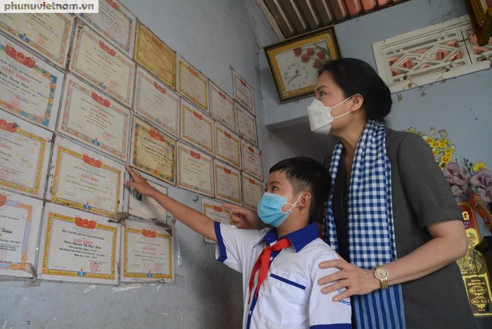 Chủ tịch Hà Thị Nga vui mừng vì Trần Nguyễn Trung Kiên luôn đạt thành tích cao trong học tập suốt nhiều năm qua