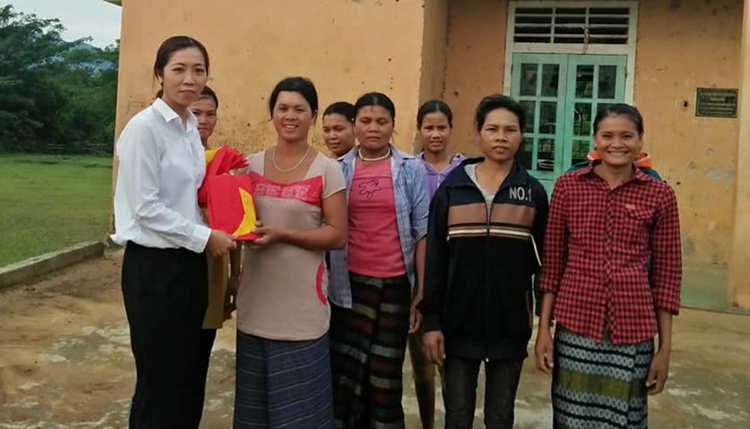 Chị Chung (bìa trái) tặng cờ Tổ quôc cho hội viên