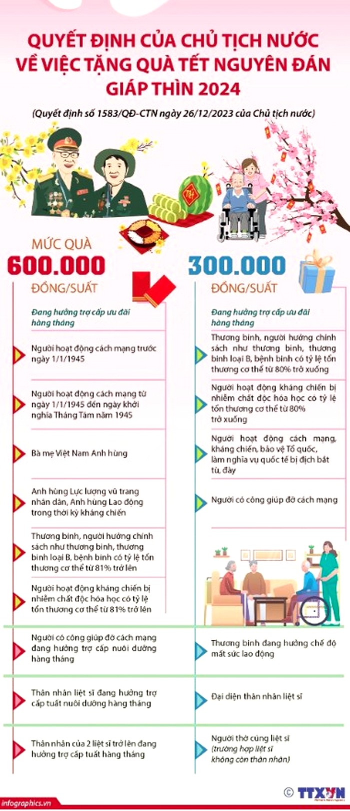 Theo Quyết định của Chủ tịch nước, có hai mức quà tặng một số đối tượng có công với cách mạng nhân dịp Tết Nguyên đán Giáp Thìn năm 2024 là 300.000 đồng/suất và mức 600.000 đồng/suất.