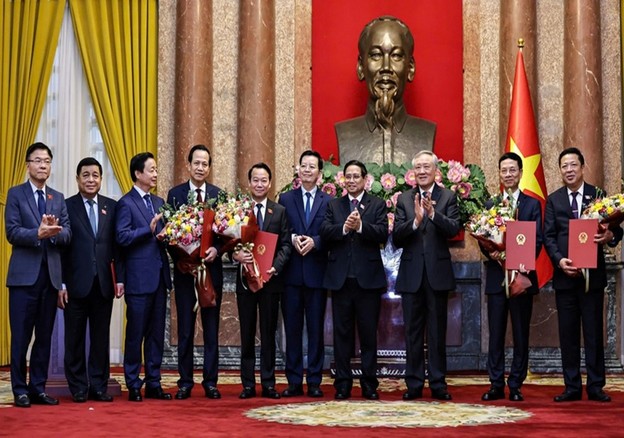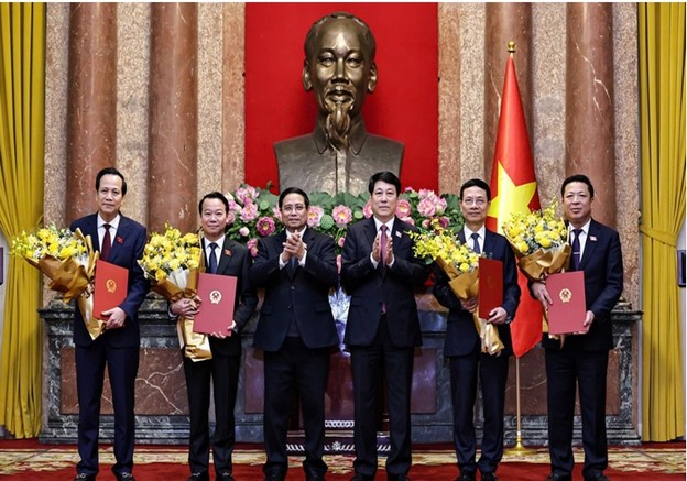 Chủ tịch nước Lương Cường trao Quyết định bổ nhiệm, Thủ tướng Phạm Minh Chính tặng hoa chúc mừng Bộ trưởng Bộ Nông nghiệp và Môi trường Đỗ Đức Duy, Bộ trưởng Bộ Xây dựng Trần Hồng Minh, Bộ trưởng Bộ Khoa học và Công nghệ Nguyễn Mạnh Hùng, Bộ trưởng Bộ Dân tộc và Tôn giáo Đào Ngọc Dung - Ảnh VGP
