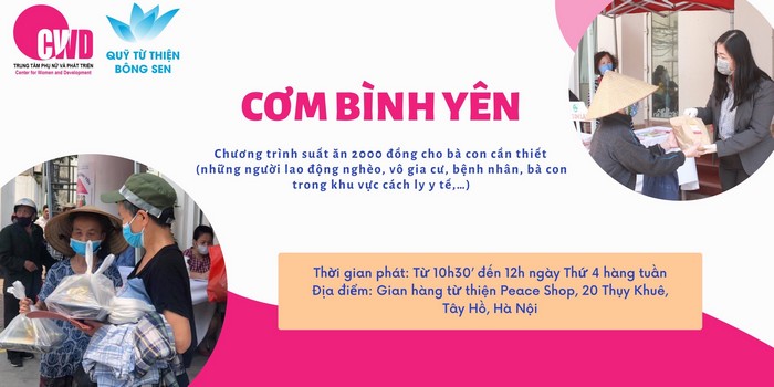 Hưởng ứng lời kêu gọi của Chính phủ và TW Hội LHPN Việt Nam chung tay phòng chống dịch Covid-19, với mục tiêu để không ai bị bỏ lại phía sau, Trung tâm Phụ nữ và Phát triển (CWD) thuộc Hội LHPN Việt Nam và Qũy Từ thiện Bông Sen - Quán cơm Yên Vui phối hợp thực hiện chương trình “Cơm Bình Yên”.