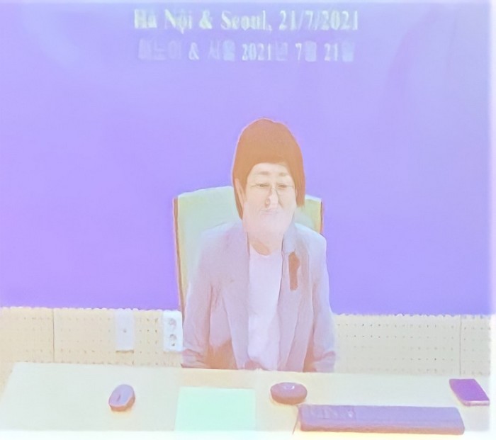 Bà Moon Yu Kyung - Viện trưởng Viện Phát triển phụ nữ Hàn Quốc phát biểu khai mạc Diễn đàn từ Seoul