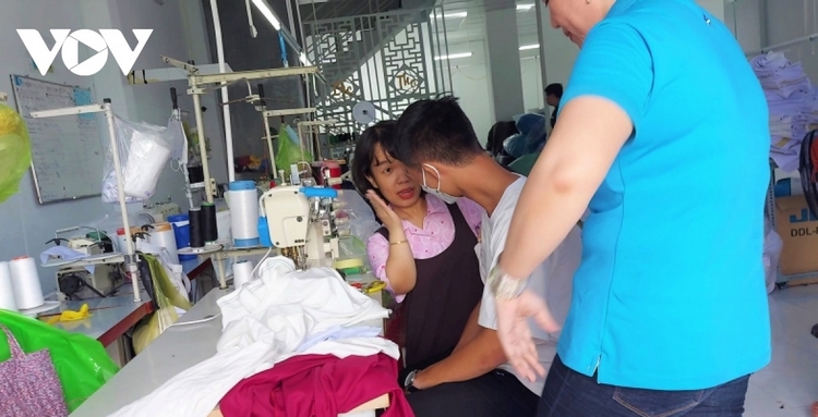 Chị Phan Bích Ngân đang hỗ trợ giúp đỡ dụng cụ chỉnh hình cho người khuyết tật.