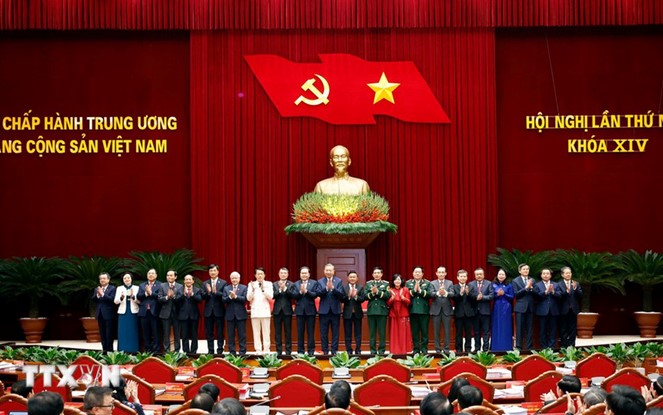 Tổng Bí thư Tô Lâm cùng các đồng chí Ủy viên Bộ Chính trị, Ủy viên Ban Bí thư Ban Chấp hành Trung ương khóa XIV ra mắt tại Hội nghị lần thứ nhất Ban Chấp hành Trung ương Đảng khóa XIV. (Ảnh: TTXVN) Tại phiên bế mạc Đại hội Đảng XIV vào chiều 23/1, Chủ tịch Quốc hội Trần Thanh Mẫn đã thay mặt Đoàn Chủ tịch công bố danh sách Bộ Chính trị khóa XIV, gồm 19 người: