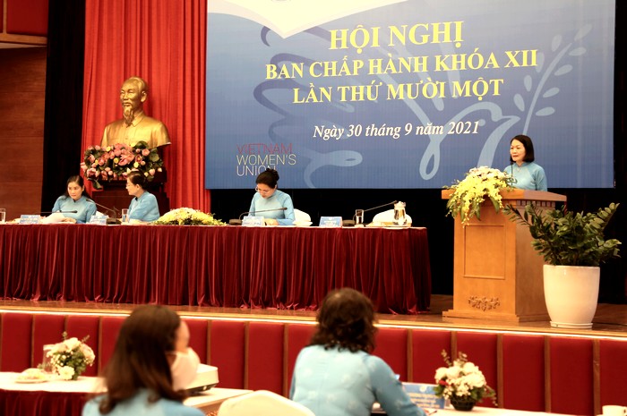Phó Chủ tịch Hội LHPN Việt Nam Bùi Thị Hoà báo cáo kết quả công tác Hội 9 tháng đầu năm 2021 tại Hội nghị BCH TW Hội LHPN Việt Nam lần thứ 11, khoá XII đã đánh giá về hoạt động tham gia phòng, chống Covid-19 của các cấp Hội