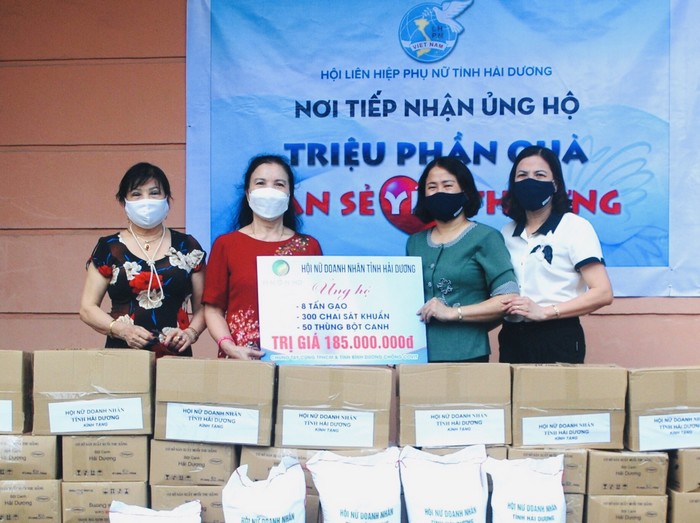 Lãnh đạo Hội LHPN tỉnh Hải Dương tiếp nhận quà ủng hộ của Hội nữ Doanh nhân tỉnh Hải Dương.