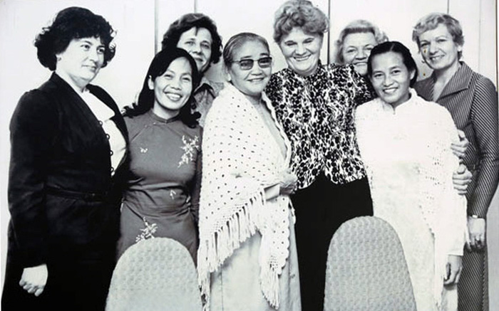 Bà Nguyễn Thị Định (thứ 4 từ trái sang) trên cương vị Phó Chủ tịch Liên đoàn Phụ nữ Dân chủ Quốc tế, Chủ tịch Hội LHPN Việt Nam với bạn bè quốc tế. Ảnh tư liệu Tự hào vì được hương khói cho những nữ anh hùng