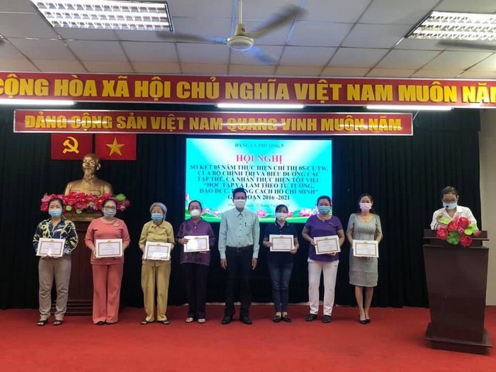 Chị Huỳnh Huệ Dung nhận khen thưởng trong lễ Sơ kết 5 năm Chỉ thị 05-CTTW, giai đoạn 2016 - 2021 của Đảng ủy phường (đứng thứ 2 bên phải)