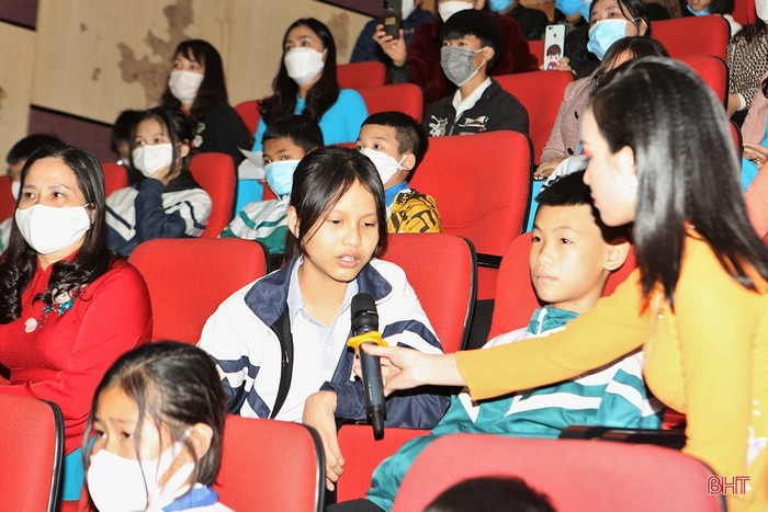 Chương trình cũng dành thời gian để giao lưu với một số nhân vật là trẻ em mồ côi và người thân, khách mời tại trường quay. Trong ảnh: Em Nguyễn Thị Thảo ở xã Cẩm Hà (Cẩm Xuyên) chia sẻ về hoàn cảnh khó khăn của gia đình sau khi bố mất vì COVID-19.
