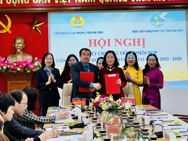 Dự hội nghị ký kết Chương trình phối hợp giai đoạn 2023 - 2028 có tập thể Thường trực Liên đoàn lao động thành phố và Hội LHPN thành phố và lãnh đạo các Ban của 2 đơn vị.