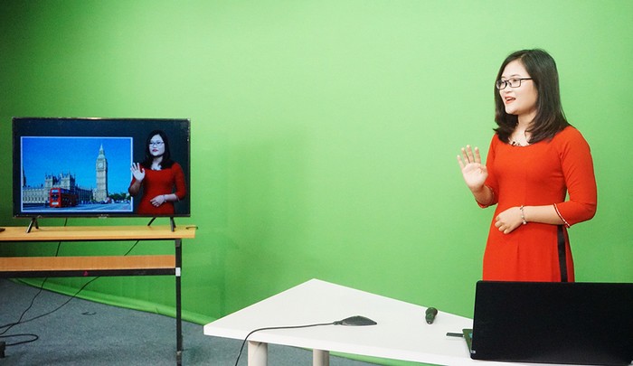 Cô Phượng trong một buổi ghi hình dạy học tiếng Anh trên sóng truyền hình