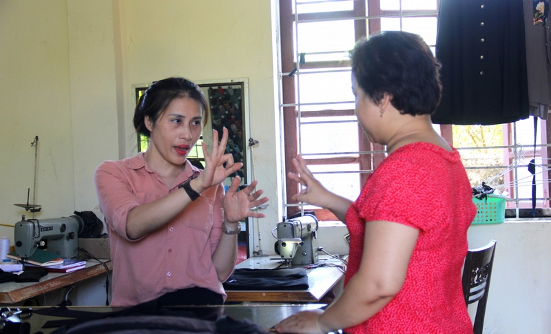 Bàn giao những tấm vải mình vừa cắt xong cho nhân công trong xưởng may, chị Trần Thị Như Hoa - chủ xưởng may Như Hoa (xã Hưng Lộc, TP Vinh, Nghệ An) - tỉ mỉ hướng dẫn thêm cho họ từng đường may, để làm sao sản phẩm đáp ứng được nhu cầu khách hàng. Nhân công trong xưởng may đều là người có khiếm khuyết về cơ thể, trong đó có những người câm điếc bẩm sinh, buộc chị phải dùng ngôn ngữ cơ thể để diễn tả.