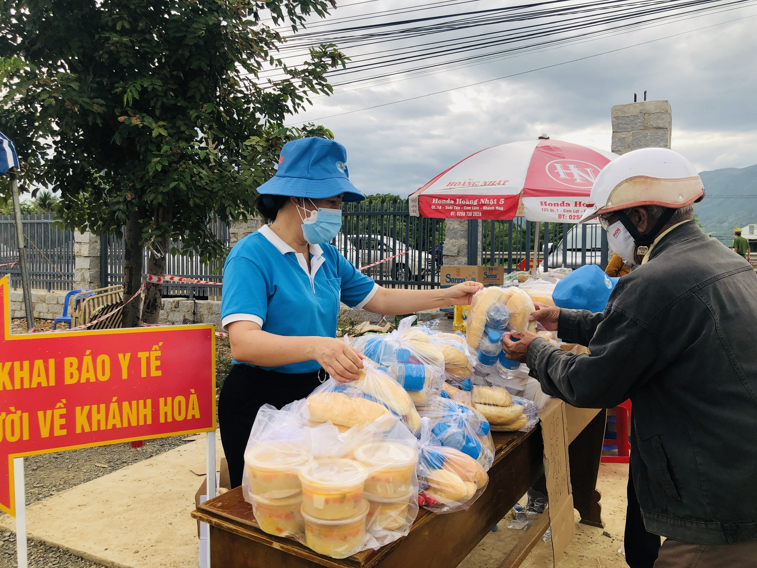 Hội LHPN tỉnh Khánh Hòa đã gửi tặng những phần cháo, bánh mì, nước uống và trứng gà tới người về quê đi bằng xe máy qua chốt kiểm soát trên quốc lộ 1 tại xã Cam Thịnh Đông, Cam Ranh.
