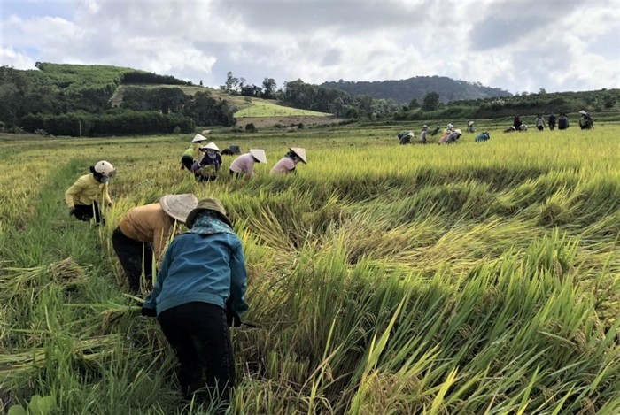 Phụ nữ huyện Kbang thu hoạch lúa giúp gia đình hội viên phụ nữ đang thực hiện cách ly y tế (Ngày 05/11/2021)