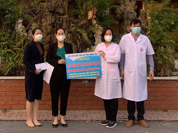 Bà Doãn Thị Nguyệt, Chủ tịch Hội LHPN tỉnh Hưng Yên (thứ 2 từ phải sang), trao quà hỗ trợ phụ nữ, trẻ em mắc Covid-19 đang điều trị tại tỉnh Nhằm kịp thời quan tâm động viên và hỗ trợ người dân, nhất là phụ nữ và trẻ em mắc Covid-19 hiện đang điều trị tại tỉnh, ngày 3/12 và ngày 6/12/2021, Hội LHPN tỉnh Hưng Yên đã tổ chức thăm, tặng quà cho 224 phụ nữ và trẻ em mắc Covid-19 hiện đang điều trị tại BV Phổi tỉnh, BV Bệnh Nhiệt đới tỉnh và BV Sản nhi tỉnh với tổng trị giá 75.200.000 đồng.