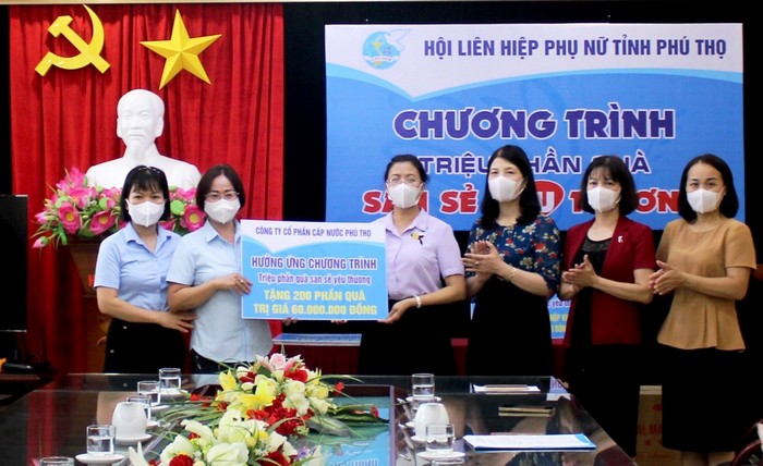 Để tiếp tục cho cuộc chiến chống dịch Covid-19 và chào mừng Đại hội phụ nữ tỉnh lần thứ XVI, Hội LHPN tỉnh đã tiếp nhận gần 1.000 phần quà với tổng trị giá trên 380 triệu đồng từ các tổ chức, đơn vị Tổng Công ty CP Super Phốt phát và hóa chất Lâm Thao; Hội Nữ doanh nhân tỉnh; Tổng Công ty CP cấp nước Phú Thọ; Sư Thầy Thích Đàm Nhã, UV BCH Hội LHPN tỉnh, Phó Ban Trị sự Hội phật giáo tỉnh Phú Thọ; Hội LHPN thành phố Việt Trì; Hội LHPN huyện Thanh Ba; Uỷ ban MTTQ Việt Nam tỉnh đã ủng hộ Chương trình "Triệu phần quà san sẻ yêu thương" và đồng hành cùng Hội LHPN tỉnh trong các hoạt động an sinh xã hội, kịp thời hỗ trợ, chia sẻ với phụ nữ, trẻ em có hoàn cảnh khó khăn bởi dịch bệnh Covid-19.