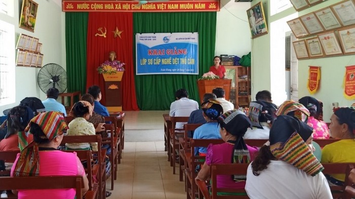 Lớp sơ cấp nghề dệt thổ cẩm được tổ chức cho hội viên phụ nữ xã Xuân Khang, huyện Như Thanh.