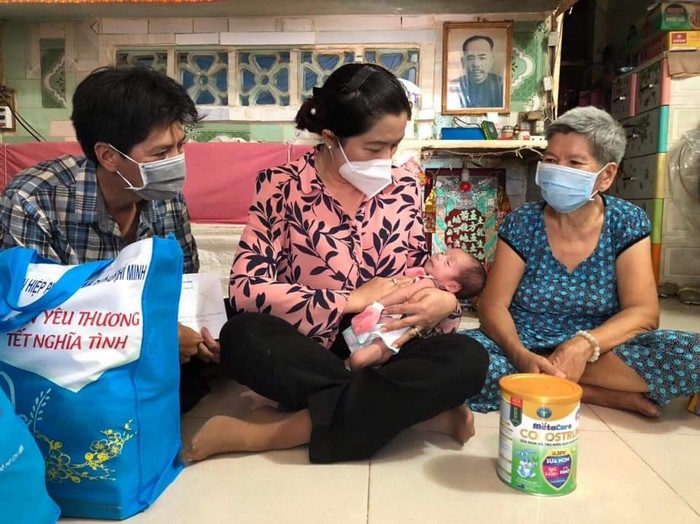 Chủ tịch Hội LHPN TP. Hồ Chí Minh Nguyễn Trần Phượng Trân trao tặng những phần quà hỗ trợ các trẻ em sơ sinh, trẻ em mồ côi cha mẹ do dịch Covid-19