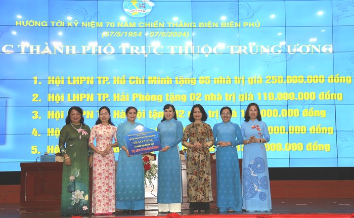| Hội LHPN Việt Nam đã vận động ủng hộ được 87 căn nhà đại đoàn kết Chương trình "Triệu tấm lòng yêu thương - Nghìn mái nhà hạnh phúc” do UB TW MTTQ Việt Nam chủ trì phối hợp với các tổ chức chính trị - xã hội, các tổ chức thành viên của Mặt trận, tỉnh Điện Biên và các cơ quan liên quan thực hiện nhằm vận động các doanh nghiệp, tổ chức, tập thể, cá nhân góp của, góp công xây dựng nhà Đại đoàn kết cho hộ nghèo, hộ cận nghèo của tỉnh Điện Biên - Tây Bắc. Được triển khai từ tháng 5/2023 đến tháng 5/2024, Chương trình đề ra mục tiêu phấn đấu hỗ trợ xây dựng 7.000 đến 8.000 căn nhà Đại đoàn kết cho hộ nghèo, hộ cận nghèo của tỉnh Điện Biên và một số địa bàn Tây Bắc. Tại lễ phát động ủng hộ làm nhà Đại đoàn kết cho hộ nghèo của tỉnh Điện Biên - Tây Bắc do UB TW MTTQ Việt Nam tổ chức vào ngày 13/5 vừa qua, Hội LHPN Việt Nam đã đăng ký ủng hộ 2,5 tỷ đồng tương đương với 50 ngôi nhà. Tuy nhiên, chỉ trong thời gian gần 1 tháng qua, Hội LHPN Việt Nam đã vận động ủng hộ được 87 căn nhà (vượt mục tiêu đặt ra số nhà phấn đấu đạt được trong hệ thống Hội là 70 căn nhà). Trong đó: TW Hội LHPN Việt Nam ủng hộ 02 căn trị giá 100.000.000 đồng; các tỉnh, thành phố, đơn vị và cá nhân ủng hộ 85 căn nhà. Tổng giá trị tính đến nay ủng hộ đạt 4.367.000.000 đồng. Một số tỉnh, thành, đơn vị tiêu biểu như: Hội LHPN thành phố Hồ Chí Minh, Hội Nữ Doanh nhân TP Hồ Chí Minh, Tập đoàn TH – Quỹ Vì tầm vóc Việt - Ngân hàng Thương mại Cổ phẩn Bắc Á, Công ty vàng bạc đá quý Phú Nhuận, mỗi đơn vị ủng hộ 05 nhà; Hiệp hội Nữ Doanh nhân Việt Nam Hiệp tặng tổng 5 nhà (Hiệp hội tặng 2 nhà; bà Thái Hương – Chủ tịch Hiệp hội, Anh hùng Lao động tặng 2 nhà; bà Hà Thị Thu Thanh – Phó Chủ tịch Hiệp hội, Chủ tịch tập đoàn Deloitte Việt Nam tặng 1 nhà); Công ty Du lịch Hòa Bình tặng 4 nhà; Hội LHPN tỉnh Hưng Yên ủng hộ 03 nhà; Hội LHPN Thành phố Hà Nội, Cần Thơ; Hải Phòng, Ban Phụ nữ Quân đội ủng hộ 02 nhà. Nhiều tỉnh có điều kiện kinh tế khó khăn nhưng cũng đã nỗ lực ủng hộ như: Đắc Nông, Bắc Kạn, Hà Giang… |