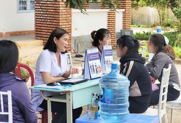Cán bộ y tế cơ sở tư vấn kiến thức về sinh đẻ an toàn và chăm sóc trẻ em cho chị em phụ nữ