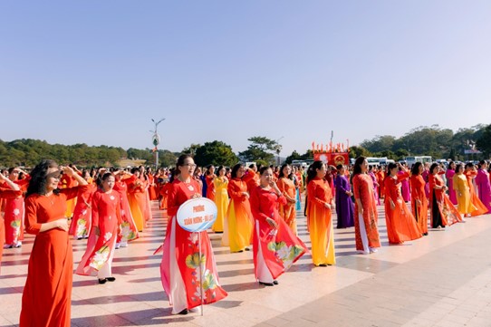 Phụ nữ phường Bắc Gia Nghĩa tham gia đồng diễn áo dài trước Tượng đài anh hùng N'Trang Lơng