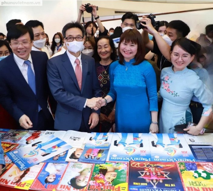 Ủy viên Trung ương Đảng, Phó Thủ tướng Chính phủ Vũ Đức Đam (thứ 2 từ trái sang) tham quan gian trưng bày của Báo Phụ nữ Việt Nam tại Hội Báo toàn quốc 2022