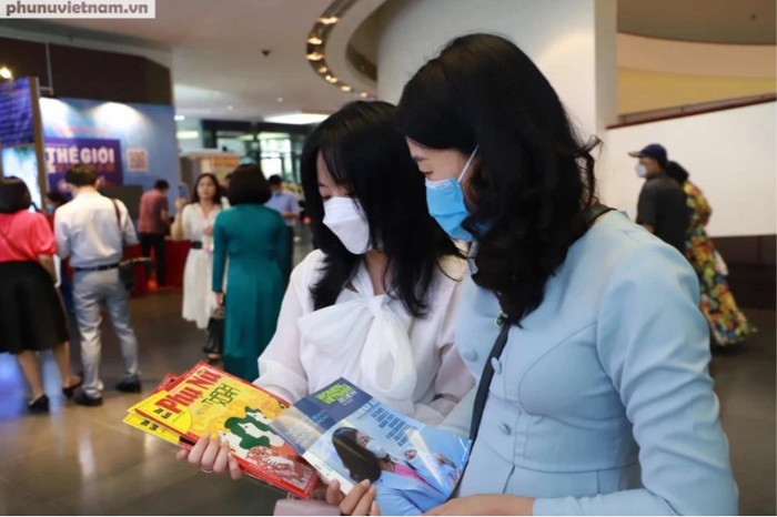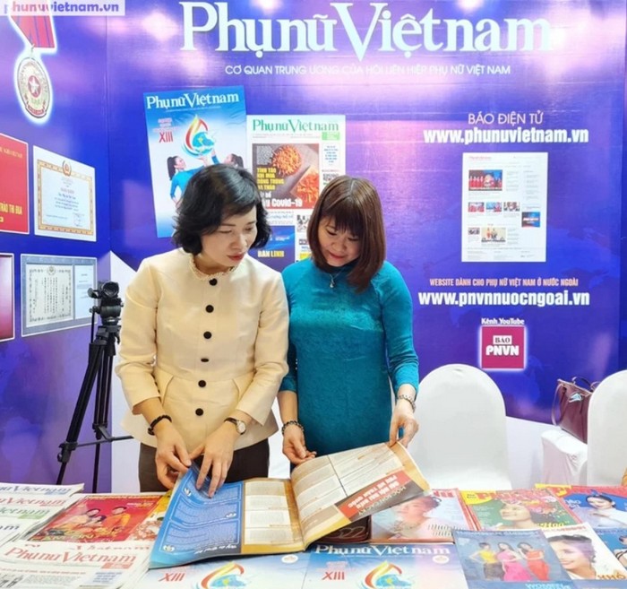 Bà Nguyễn Thị Kim Dung (trái), Trưởng ban Tuyên giáo (TƯ Hội LHPN Việt Nam) và bà Nguyễn Thị Thục Hạnh, Tổng biên tập Báo PNVN, tại gian trưng bày của Báo Phụ nữ Việt Nam