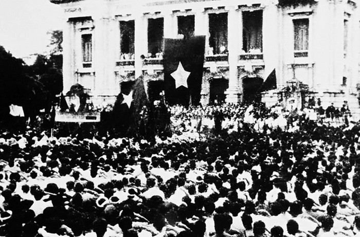 Lá cờ đỏ sao vàng tung bay trong cuộc mít-tinh diễn ra tại quảng trường Nhà hát Lớn (Hà Nội), ngày 19/8/1945 - Ảnh tư liệu