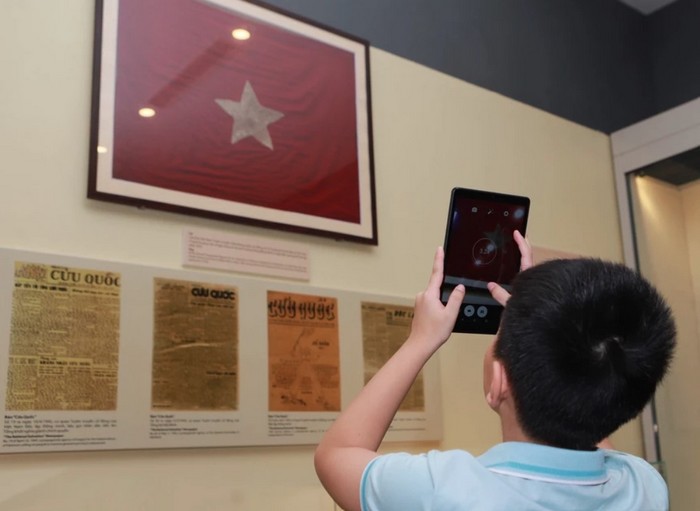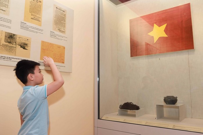 Trong cuộc Tổng khởi nghĩa tháng Tám năm 1945, hình ảnh đi vào lòng người là lá cờ Cách mạng của Mặt trận Việt Minh, biểu tượng hiệu triệu nhân dân đứng lên giành chính quyền, giành độc lập dân tộc. Hiện nay, Bảo tàng Lịch sử Quốc gia Việt Nam vẫn lưu giữ những lá cờ mang dấu ấn của thời khắc lịch sử ấy, trong đó có lá cờ Tổ quốc treo tại Đại hội Quốc dân Tân Trào trước Tổng khởi nghĩa. Trải qua 78 năm, lá cờ Tổ quốc treo tại Đại hội Quốc dân Tân Trào (huyện Sơn Dương, Tuyên Quang) đã ngả màu thời gian nhưng kỷ vật thiêng liêng này vẫn chạm được vào cảm xúc của mỗi người con đất Việt khi đến tham quan Bảo tàng. Trong ảnh là một du khách nhí đứng chào trước lá cờ Tổ quốc được treo tại Đại hội Quốc dân Tân Trào. - Ảnh: Hải Hòa