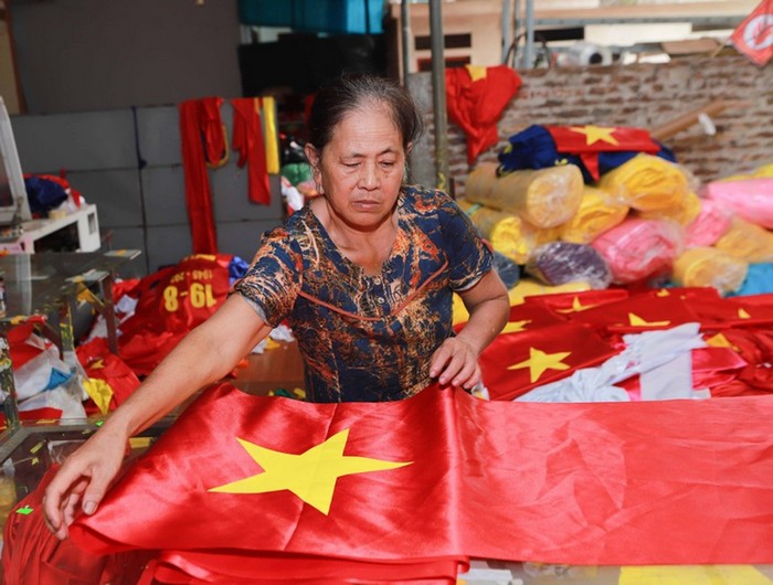 Làng Từ Vân (xã Lê Lợi, huyện Thường Tín, Hà Nội) vốn nổi tiếng với nghề thêu truyền thống. Tháng 8/1945, Ủy ban kháng chiến kêu gọi các nghệ nhân của làng thêu cờ Tổ quốc chuẩn bị cho Tổng khởi nghĩa và ngày Lễ tuyên ngôn độc lập. Ngày 19/8/1945, hàng ngàn lá cờ của làng Từ Vân đã nhuộm đỏ các con phố, tung bay rực rỡ ở quảng trường Ba Đình lịch sử. Ngày nay, phụ nữ trong làng vẫn duy trì nghề may cờ Tổ quốc. - Ảnh: Hải Hòa