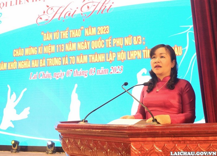 Phát biểu khai mạc Hội thi, đồng chí Khoàng Thị Thanh Nga - Chủ tịch Hội LHPN tỉnh, Trưởng ban Tổ chức Hội thi nhấn mạnh: Hội thi Dân vũ thể thao năm 2023 nhằm tạo sân chơi lành mạnh, bổ ích cho hội viên, phụ nữ, góp phần nâng cao đời sống văn hóa tinh thần cho phụ nữ, xây dựng hình ảnh người phụ nữ Lai Châu thời đại mới phát triển toàn diện cả về đạo đức, nhân cách, trí tuệ, thể chất và năng lực, có sức khỏe để thực hiện tốt trách nhiệm với bản thân, gia đình, xã hội và đất nước, Hội Liên hiệp phụ nữ tỉnh nhận thấy Dân vũ thể thao là môn nghệ thuật quần chúng đơn giản nhưng vui nhộn và hướng về cộng đồng. Với những bước nhảy nhẹ nhàng, đơn giản, kết hợp các bài nhạc sôi động, vui tươi, dễ học, phù hợp với nhiều lứa tuổi, đã thu hút đông đảo hội viên, phụ nữ tham gia. Luyện tập môn này thấy tinh thần thoải mái, năng động và tự tin hơn.
