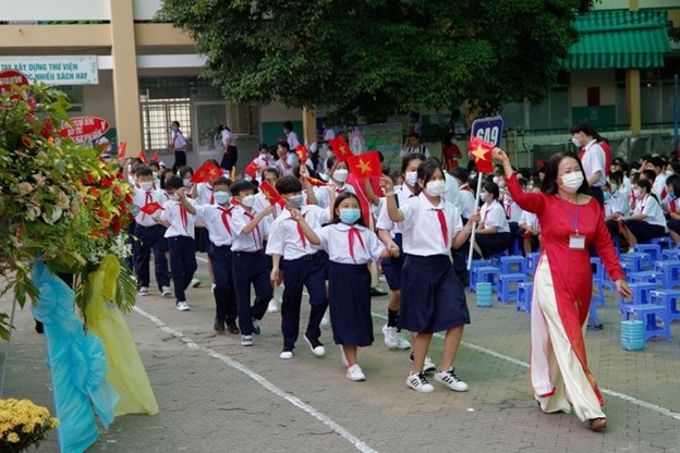 Cô và trò Trường THCS Chánh Hưng (quận 8) tại lễ khai giảng sáng 5/9 - Ảnh: Minh Tuấn