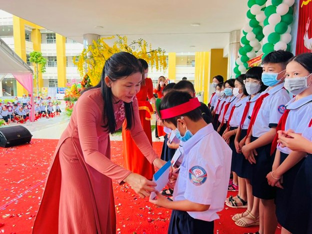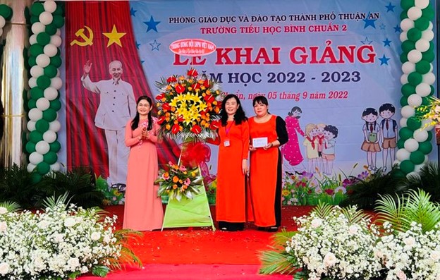 Ủy viên dự khuyết TƯ Đảng - Phó Chủ tịch Hội LHPN Việt Nam Tôn Ngọc Hạnh (bìa trái) dự lễ khai giảng tại Trường Tiểu học Bình Chuẩn 2 (TP.Thuận An) - Ảnh: Thùy Dung
