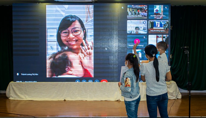 Mẹ đỡ đầu Lương Thị Vân Thành ở TPHCM chào gia đình các con đỡ đầu ở huyện Tây Hòa, tỉnh Phú Yên, qua màn hình