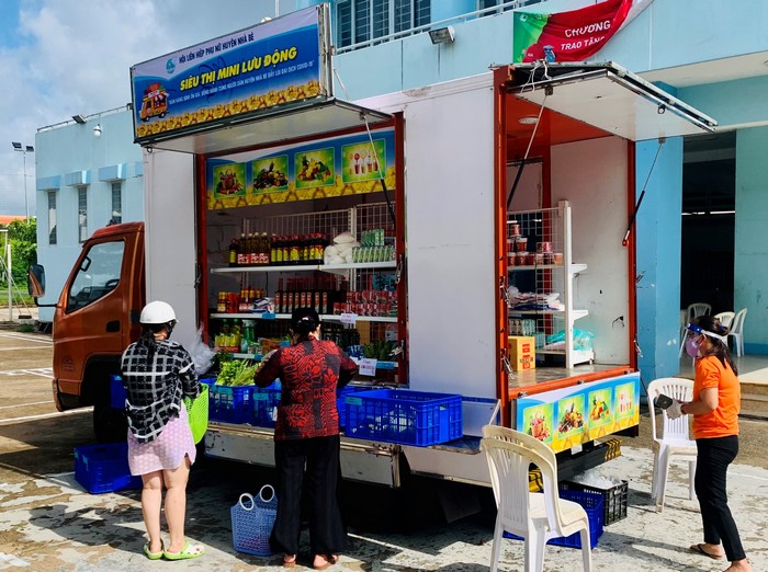 Bên cạnh siêu thị 0 đồng, Hội LHPN huyện Nhà Bè còn vận động kinh phí thực hiện mô hình “Siêu thị mini lưu động” trên chuyến xe với hơn 70 mặt hàng gồm thực phẩm, nhu yếu phẩm, rau củ quả... các nguồn thực phẩm được Hội đặt mua tại Co-op Mart Nguyễn Bình và bán cho người dân với giá cả bình ổn.
