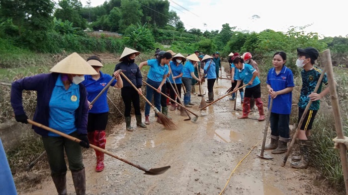 Chị em tham gia vệ sinh đường làng, ngõ xóm sau ngập lụt.