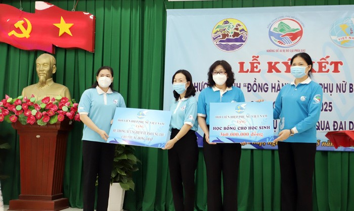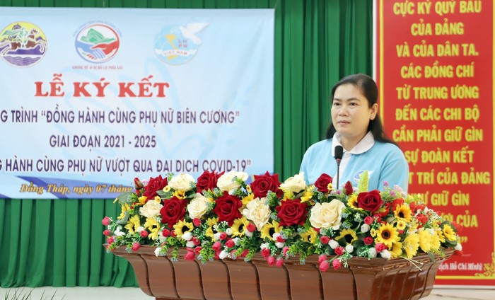| Nhiều đơn vị hỗ trợ chương trình "Đồng hành cùng phụ nữ biên cương" tại Đồng Tháp, giai đoạn 2021-2025 Hội LHPN Việt Nam đã trao 360 triệu đồng hỗ trợ học bổng cho học sinh vượt khó học giỏi; 300 triệu đồng hỗ trợ vốn phát triển kinh tế; trao 800 triệu đồng do Hội LHPN Việt Nam vận động Hội Nữ doanh nhân TPHCM hỗ trợ phụ nữ phát triển kinh tế tại huyện Tân Hồng, Hồng Ngự, Tam Nông và thành phố Hồng Ngự. Ngân hàng thương mại cổ phần Phát triển TPHCM hỗ trợ 30 mái ấm tình thương và 300 thẻ bảo hiểm, tổng trị giá 1,5 tỷ đồng; công ty tài chính Home Credit Việt Nam hỗ trợ phụ nữ khởi nghiệp trị giá 100 triệu đồng; Hội LHPN tỉnh Bạc Liêu hỗ trợ 2 mái ấm tình thương và 20 phần quà tổng trị giá 66 triệu đồng; Hội nữ doanh nhân tỉnh Đồng Tháp hỗ trợ 1 mái ấm tình thương trị giá 30 triệu đồng; Bộ chỉ huy Bộ đội Biên phòng tỉnh Đồng Tháp hỗ trợ nâng bước em đến trường, hũ gạo tình thương, con nuôi bộ đội Biên phòng. Ngoài ra, các mạnh thường quân còn hỗ trợ hệ thống xét nghiệm tế bào ung thư, cây xanh, hỗ trợ mô hình xử lý rác, máy đo huyết áp cho gia đình chính sách… |